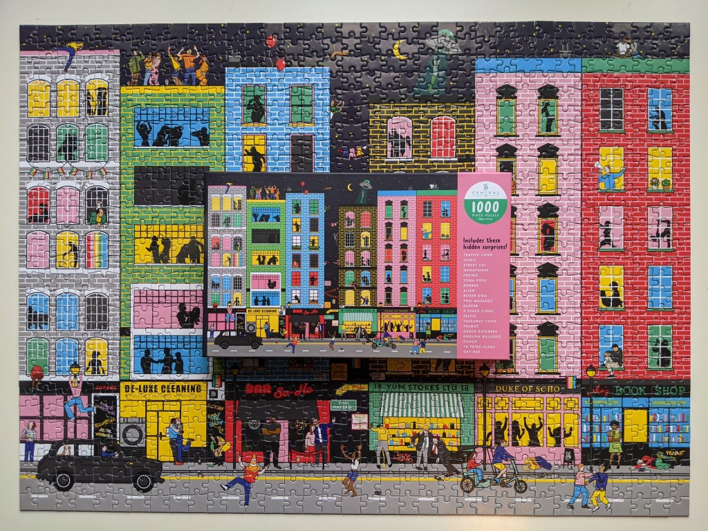 Central 23 has come on the puzzle scene with an amazing group of original art puzzles. Based out of Soho, London, their mission is to create the world’s “funnest puzzles”, and I think they have achieved that. I have my eye on a few of their modern designs, and they were kind enough to send me one of their 1000 piece puzzles, Midnight in Soho, for review.