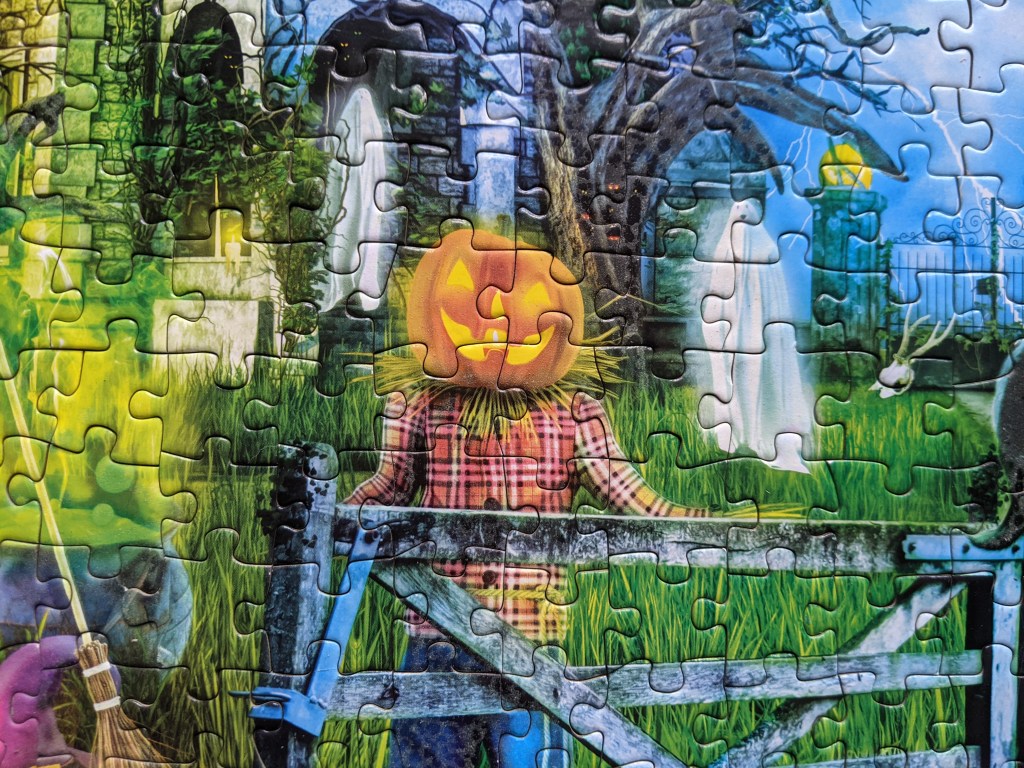 This was a super fun puzzle. I did it very casually and took my time. It was fun to piece together all the different sections. The purple half, the blue half, the pumpkin patch, the spooky path that I would absolutely never go down… I think it’s the perfect mix of scary and fun!