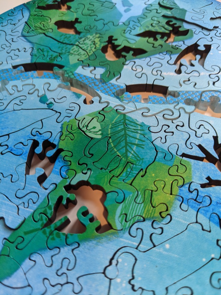 First of all, the pieces aren’t only just wooden. There are also acryllic pieces! I loved how the acryllic pieces flowed through the center of the Earth like a river. The whimsies were perfect for the puzzle and fit the Earth theme. A really cool aspect of this puzzle was the mini puzzles within the finished puzzle. The box contained the most handy-dandy tool that I have used non stop for other wooden puzzles since. It’s basically a pen but instead of ink at the tip for writing, it has a sticky tip to grab out whimsy pieces without having to tear about your whole puzzle. You heard me! No breaking apart half the puzzle to pull out whimsies! Magic I tell ya!